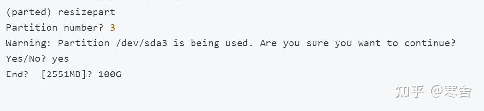 第四步,上面的3就是软件包所在的分区,也就是需要扩容的分区。执行命令“resizepart”,”Partition number? “处输入“3”,然后是“yes"。”End? [2551MB]? “后面根据自己的实际,输入需要扩容的大小,我输入的是100G